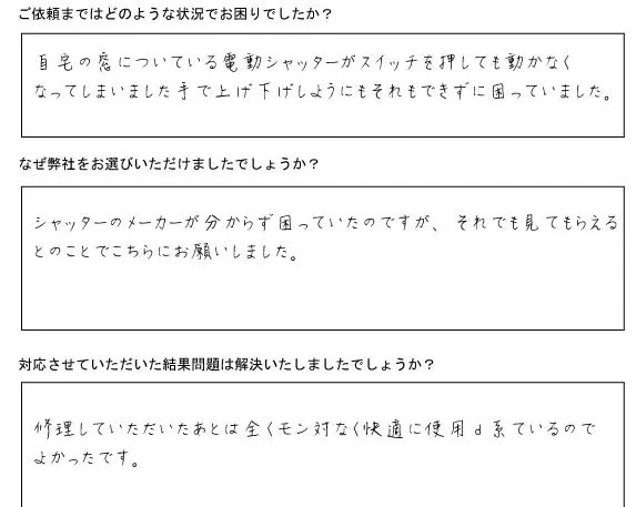 老人ホームの出入り口に設置されている自動ドアなのですが、外から入る際はタッチ式で内側から出るときは暗証番号を入力して開ける自動ドアになっていまして、その自動ドアがタッチ式のボタンのほうの電池を入れ替えても開閉しなくなってしまいました。お年寄りが多いので、自動ドアを手の力で無理やり開けるのは難しく、なるべく早めに修理してくださるところを探していたところ、こちらのホームページを見て、迅速に対応していただけそうだと思い選びました。こちらの要望に合わせて、至急近日中に修理してくださることになり本当に助かりました。 -